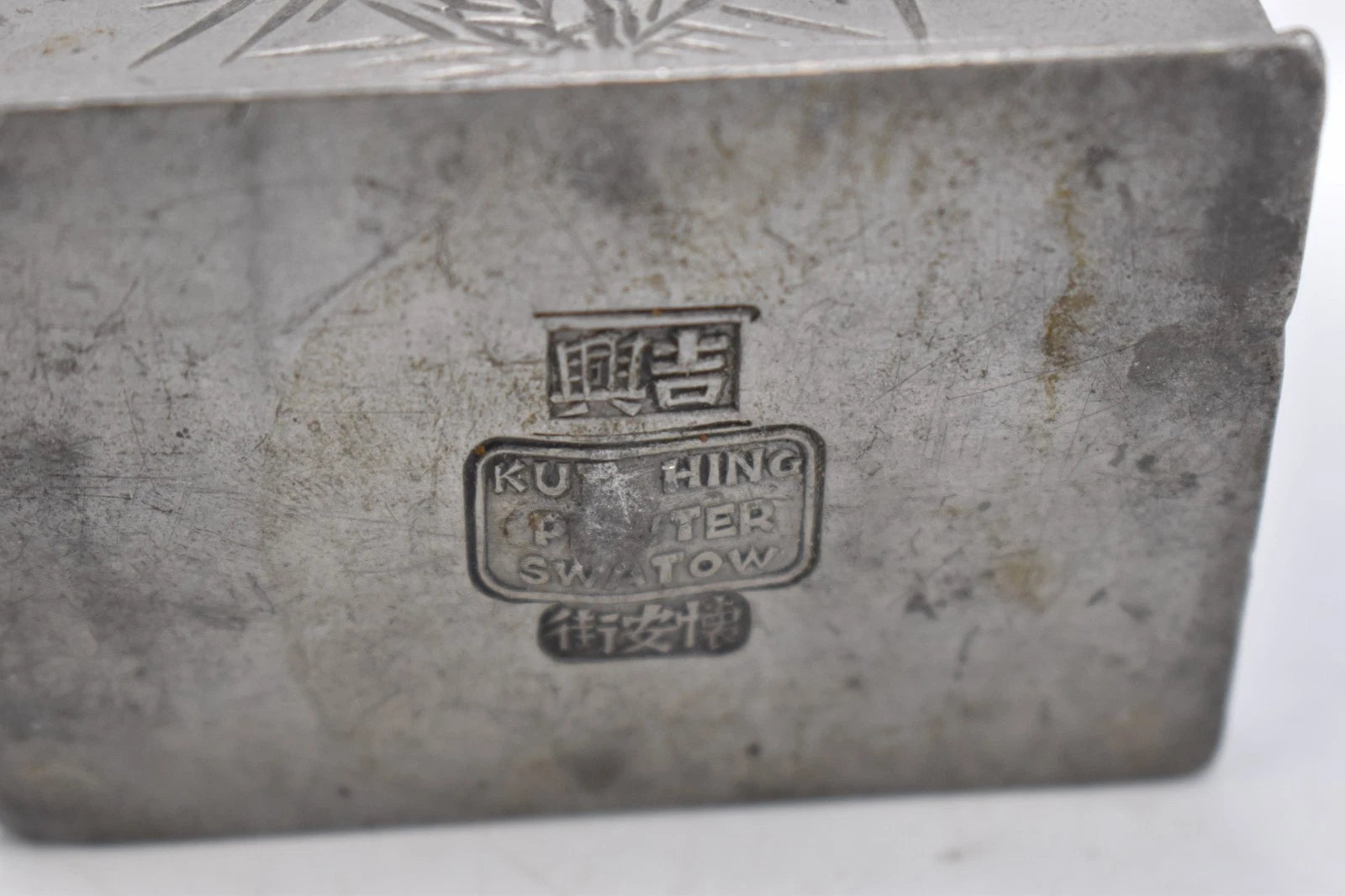 This antique Chinese Kut Hing pewter Swatow box is a beautifully crafted collectible, likely intended as a match dispenser. Featuring fine detailing and traditional craftsmanship, it is ideal for collectors of Chinese antiques or decorative pewter items.