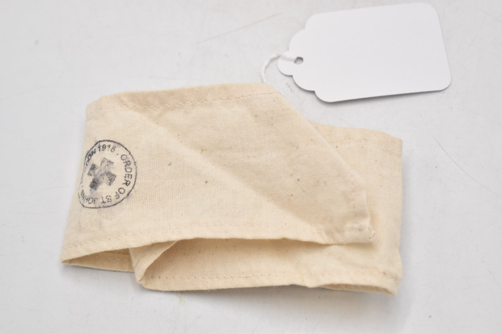 Original British Army WWI Medical Armband issued by the Order of St John, dated London 1916. A rare and historical piece of World War I military medical equipment, ideal for collectors, historians, or museum display.