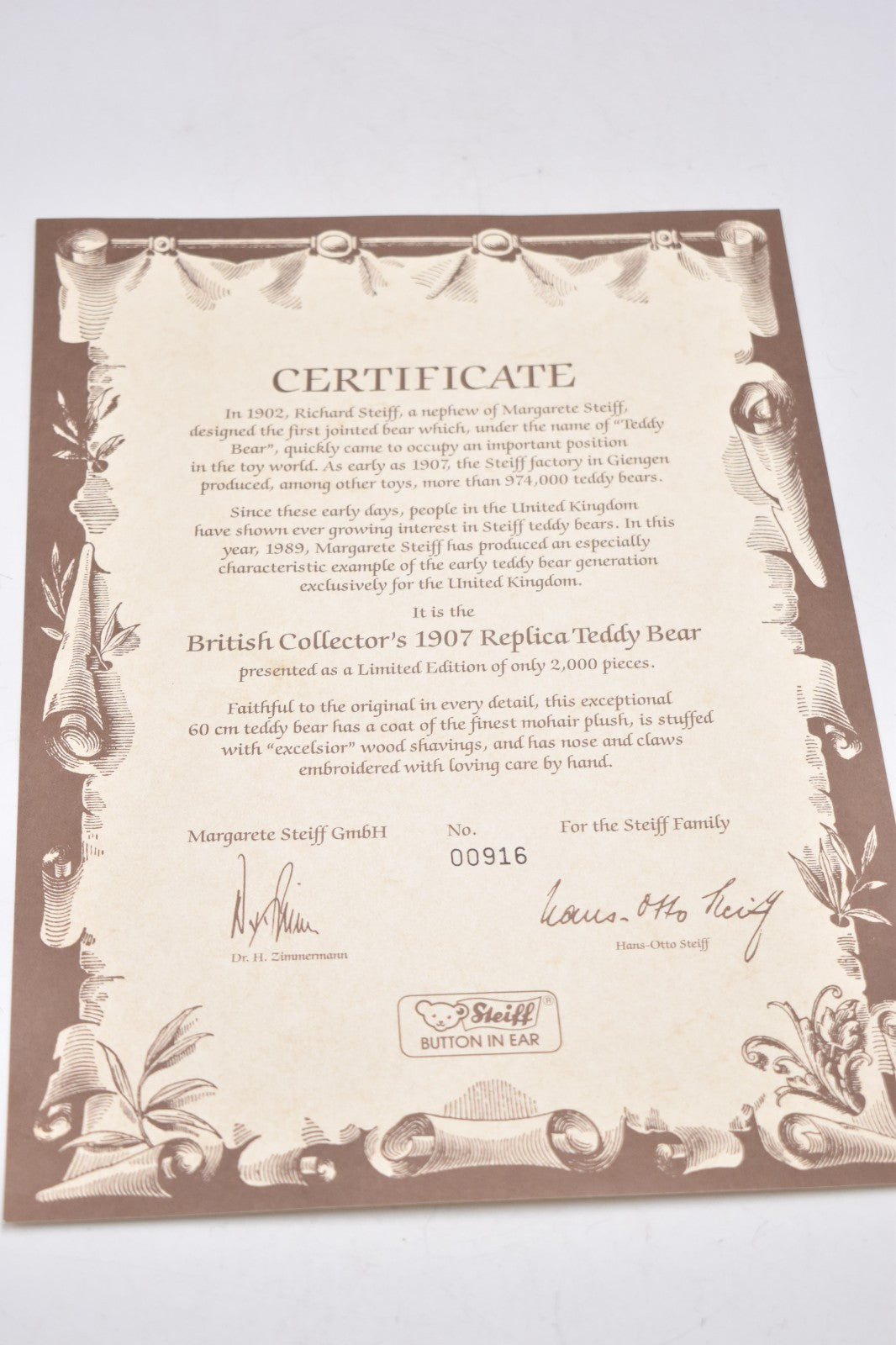 This impressive British Collector's Edition 1907 Replica Teddy Bear by Steiff (EAN 406102 / 0174/61) is a sought-after collectible, made in a limited edition of 2000 pieces. This one is number 916 and comes with its original certificate of authenticity and Steiff box.