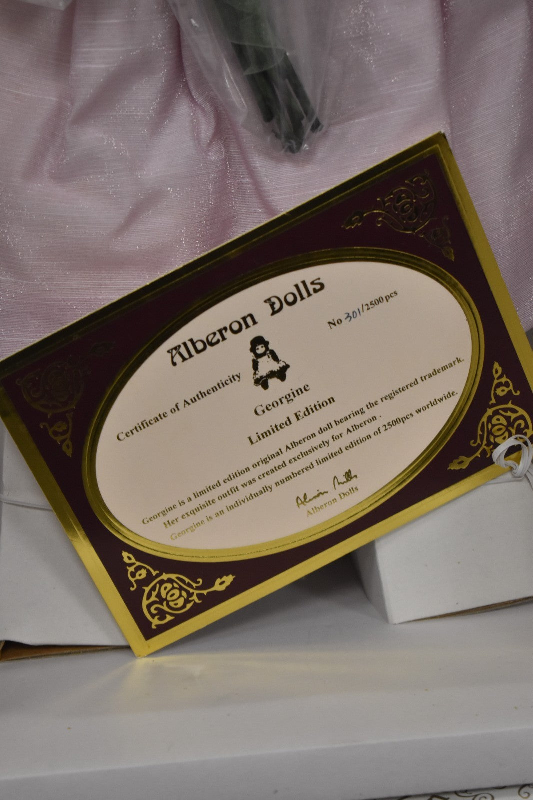 A beautiful vintage Alberon "Georgine" porcelain doll, limited edition and retired, in excellent condition. She has never been removed from her original box and comes with her certificate of authenticity (edition number 301 of 2,500).