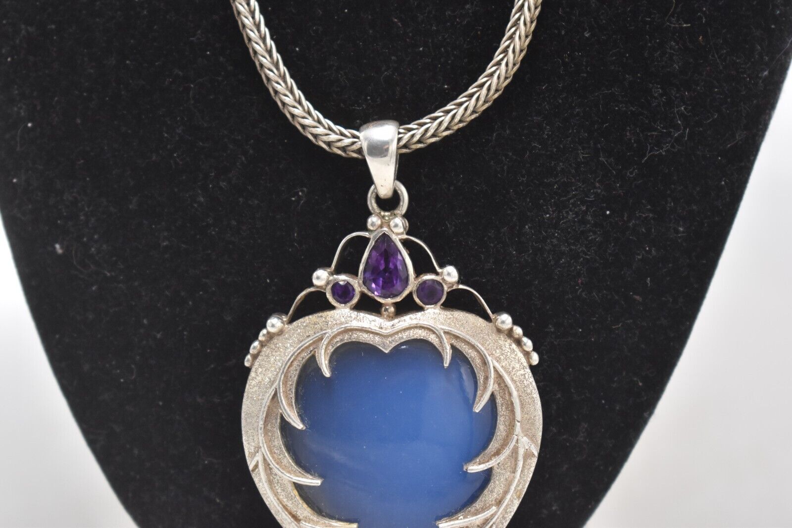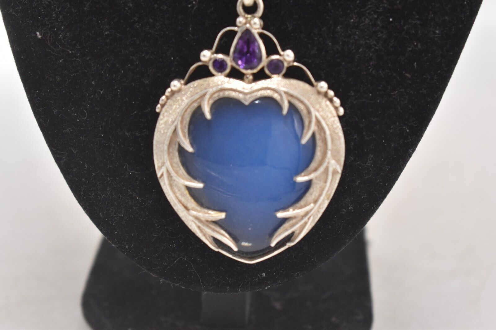 This Vintage Art Nouveau Revival Sterling Silver Pendant Necklace is a striking and elegant statement piece, featuring amethyst and quartz gemstones set in beautifully detailed 925 sterling silver. In lovely condition, this large and eye-catching pendant is perfect for collectors and jewellery lovers alike.