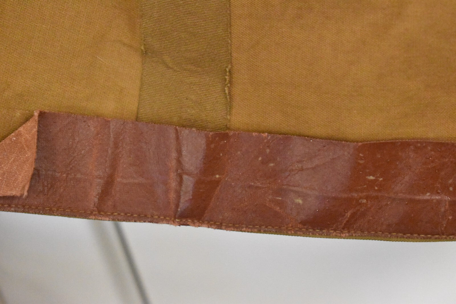 This is a genuine British Army Officer's raincoat from the 1940s, featuring the distinctive Broad Arrow stamp inside, confirming official military issue. Constructed from durable, water-resistant fabric, this long overcoat was designed for foul weather use while maintaining a smart military appearance. It measures 20" pit to pit, equating to a 40" chest, and remains in good overall condition for its age.