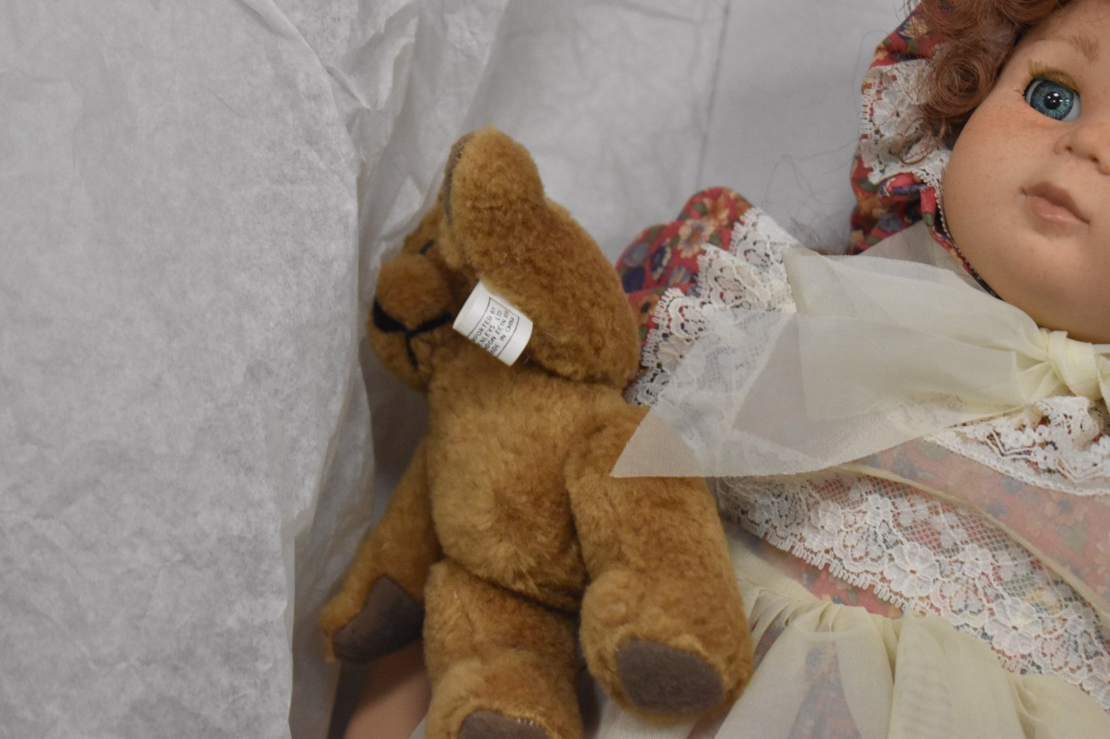 A charming vintage D'Azucar life-like girl doll in lovely overall condition. This doll features blinking eyes that work as intended, comes with her original swing tag, and is boxed for safe storage or display.